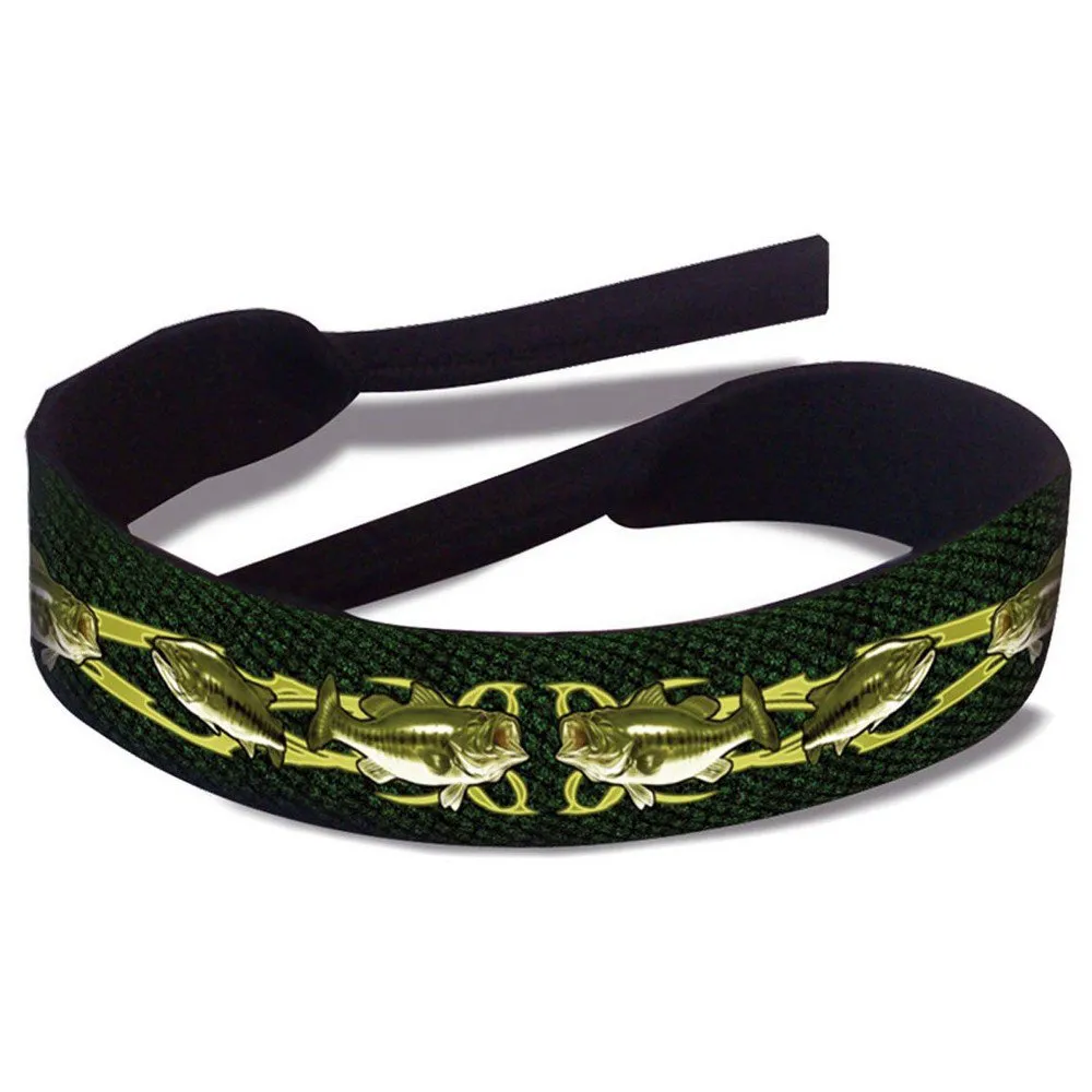 Neoprene retainer with Bass design slips onto temples of sunglasses, and keeps sunglasses in place and from getting lost. Prevents Loss of Eyewear. Ends of Strap Attach to Sunglasses Temple Tips.