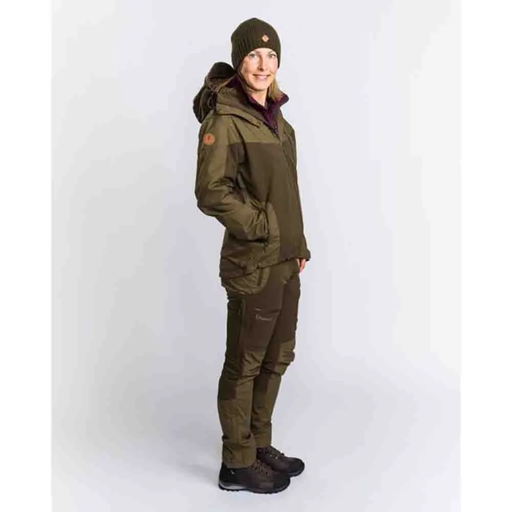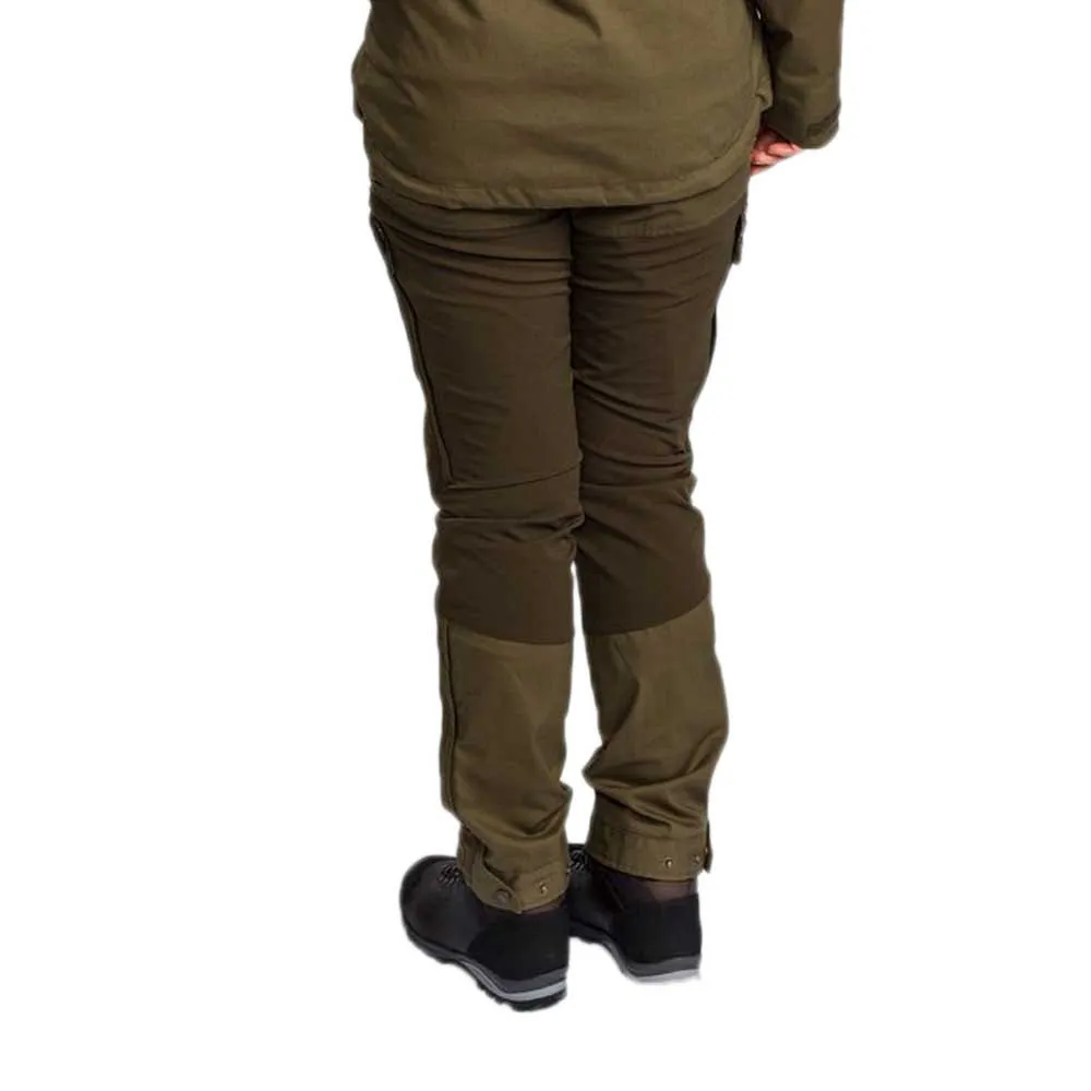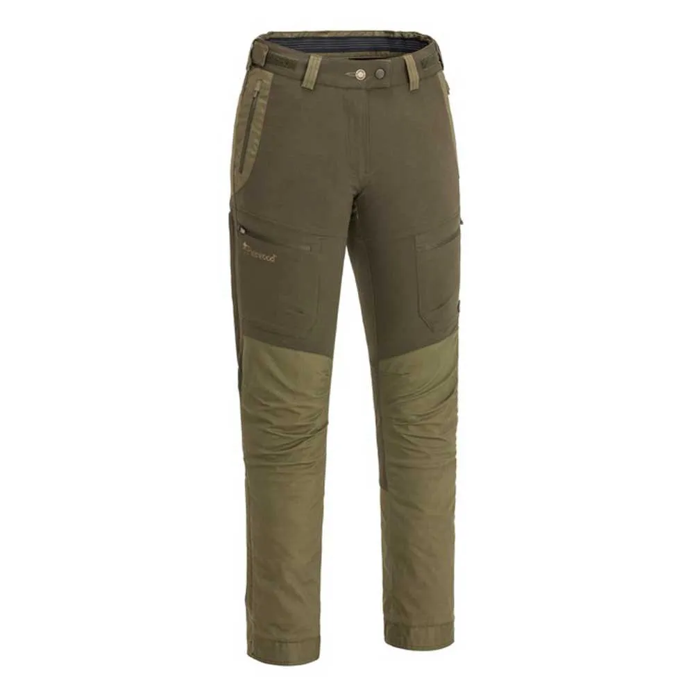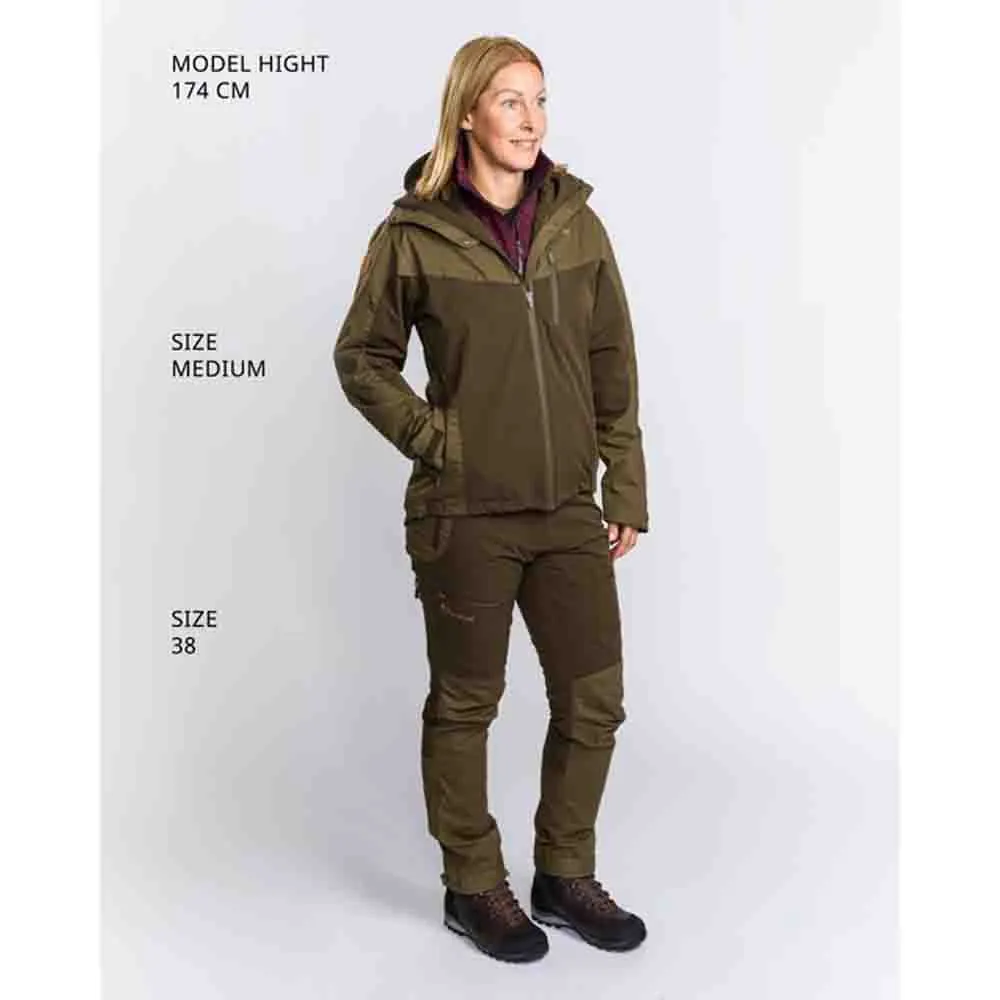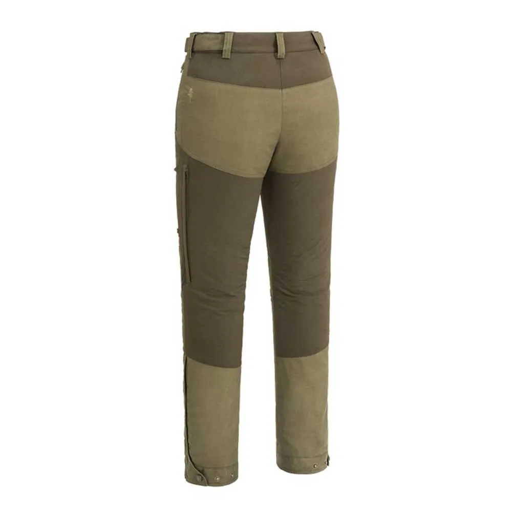 Versatile and strong hybrid trousers suitable for hiking, everyday use and hunting. Waxed surface and taped seams for extra water repellent properties. Ventilation zippers on both sides. Spacious pockets with zippers. Adjustable waist with hook-and-loop fastener. Adjustable bottom and boot hook.