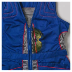 On the front are large double cartridge pockets and a chest strap for your shooting goggles.