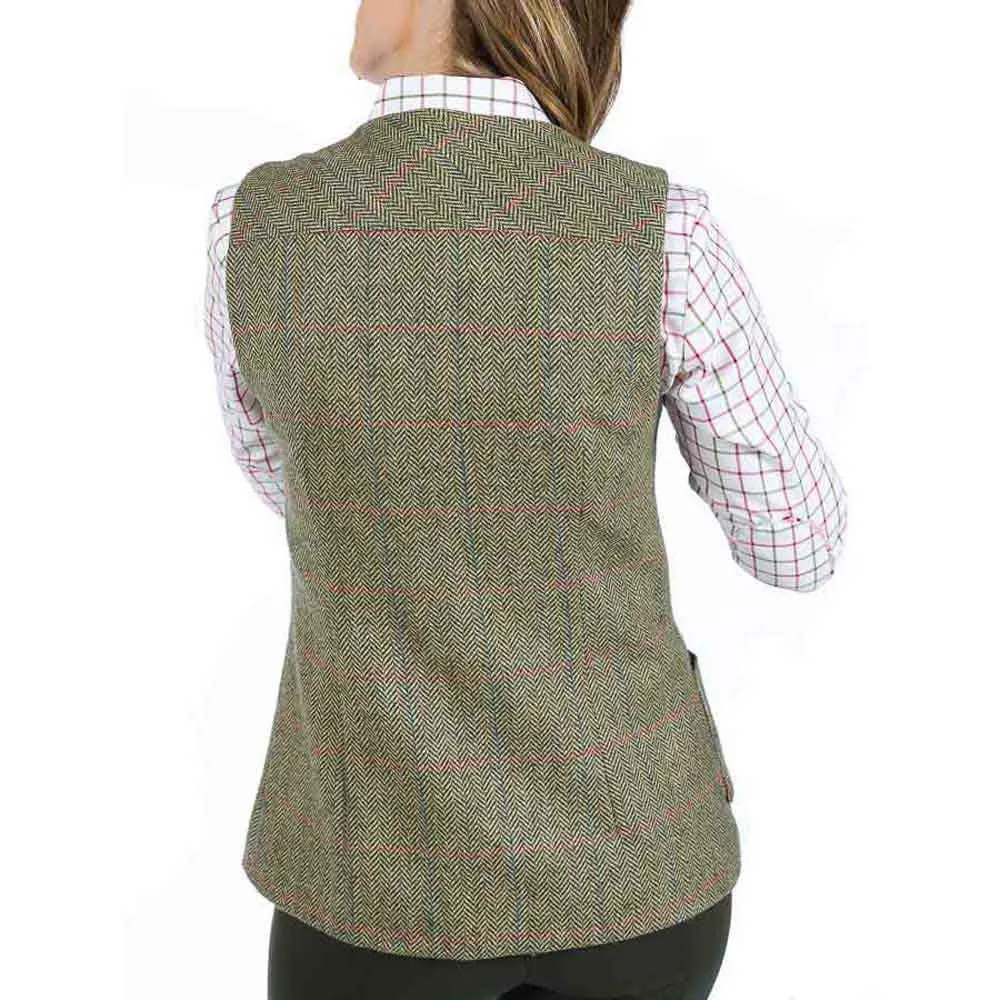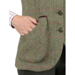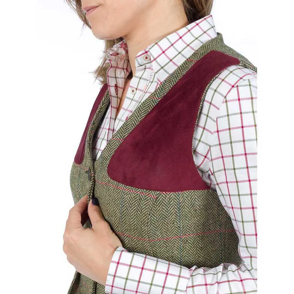 Khaki shooting vest made of tweed and Suede. Slim cut with seams on the front. Front with suede reinforcements. Closure with four metal buttons. Bellows pockets with buttonhole detail in Suede.